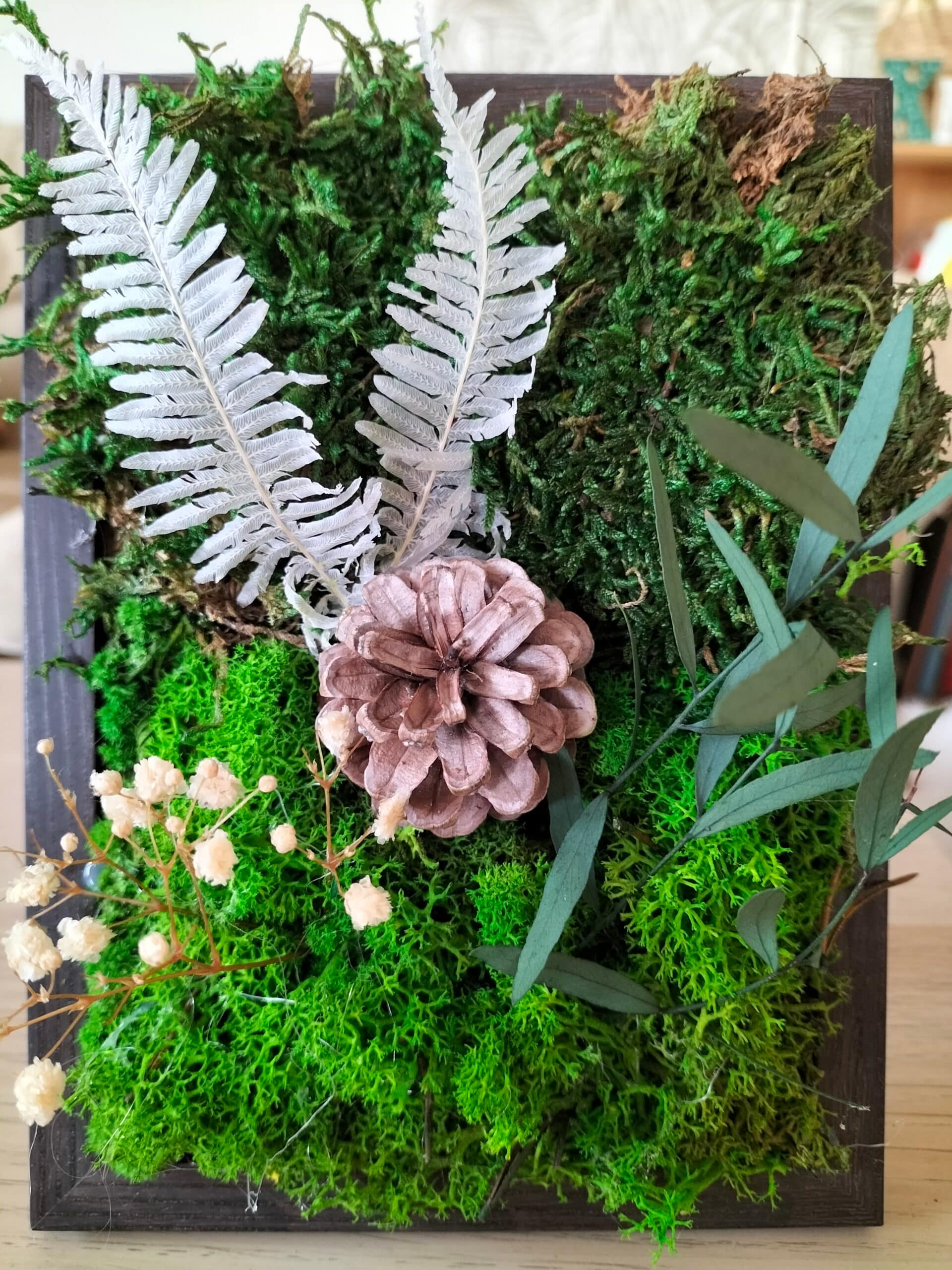 Plongez dans l’univers apaisant du design végétal avec notre kit complet pour créer votre propre tableau en mousse et végétaux stabilisés. Pensée pour la saison froide, la composition « Brume d’Hiver » joue sur des contrastes doux et naturels : l’éclat du blanc, la profondeur des nuances de vert et l’authenticité du bois.